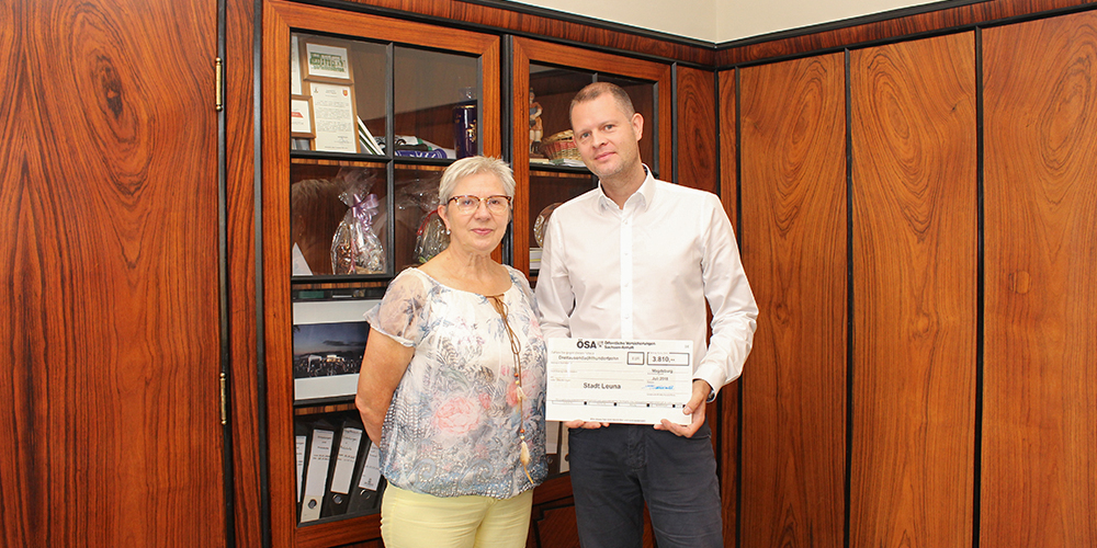 Die Stadt Leuna hat am 4. September 2018 von den Öffentlichen Versicherungen Sachsen-Anhalt (ÖSA) eine kräftige Geldspritze erhalten. Den Scheck über 3.810 Euro nahm Bürgermeisterin Frau Dr. Dietlind Hagenau vom ÖSA-Geschäftsstellenleiter David Schade entgegen. „Die Stadt Leuna hat im vergangenen Jahr die Schäden an ihren Gebäuden, an Inventar und Vermögen erfreulich gering halten können“, begründet David Schade die Zuwendung: „Dafür werden die Stadt und damit auch ihre Einwohner am wirtschaftlichen Erfolg der ÖSA beteiligt.“