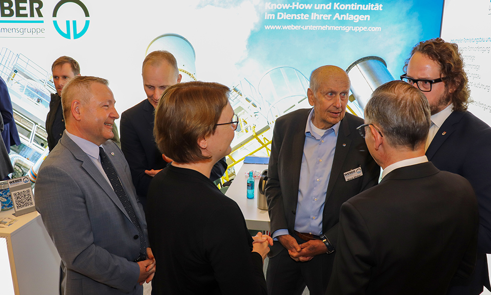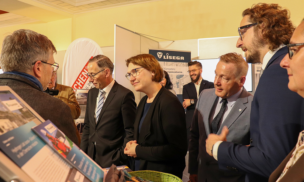 Stefanie Pötzsch, Staatssekretärin im Ministerium für Wirtschaft, Tourismus, Landwirtschaft und Forsten des Landes Sachsen-Anhalt, informierte sich gemeinsam mit Dr. Christof Günther, Bürgermeister Michael Bedla und Sebastian Müller-Bahr, Oberbürgermeister der Stadt Merseburg, bei verschiedenen Ausstellern, wie z. B. der Merseburger Merco MTW oder beim Fraunhofer Institut.