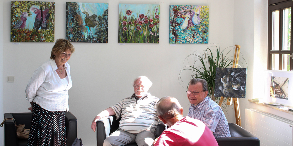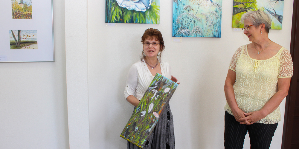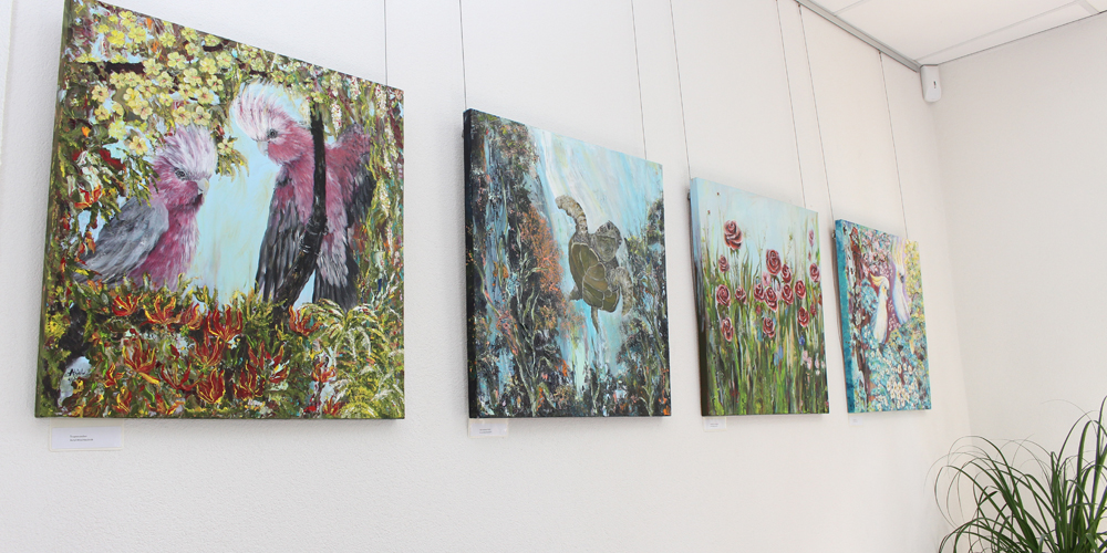 Am 8. Mai 2018 freute sich die Bürgermeisterin, die Ausstellung „Farben-Spiele“ im Foyer des Rathauses eröffnen zu dürfen. Die Räumlichkeiten erhielten durch die Aquarelle und Acrylmalereien einen ganz besonderen, frischen und bunten Rahmen. Anett Thiel zeigt hier einen Querschnitt durch ihre Arbeiten, die durch vielseitige Techniken geprägt sind. Es sind Aquarelle mit Motiven aus Leuna und der Region zu sehen. Besonders farbenprächtige Bilder entstanden aus dem Spiel mit Acrylfarben, erläutert die Künstlerin. Eine Art Zufallstechnik lässt bunte Vögel, eine Schildkröte oder Blumen in kräftigen kontrastreichen Farben entstehen. So bringt sie die Farbe nach dem Zufallsprinzip auf die Leinwand und lässt diese erst einmal trocknen. Erst nach längerer Betrachtung sieht ihr künstlerisch geprägtes Auge, welches Motiv sich entwickelt hat. Passend zum Hintergrund entsteht dann mit Pinsel oder Spachtel ein buntes und ausdrucksstarkes Bild.
