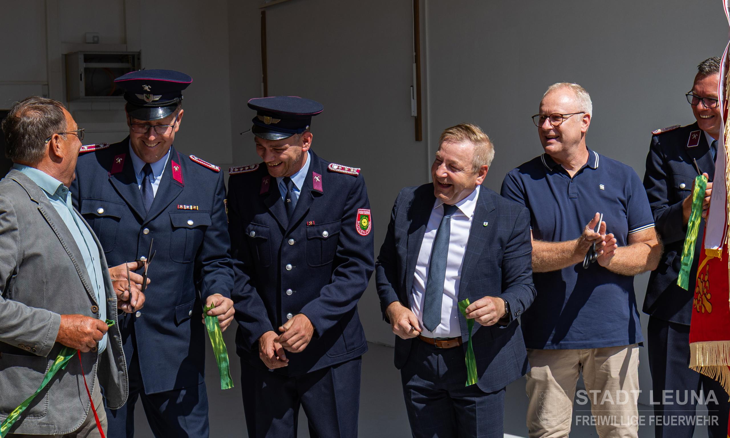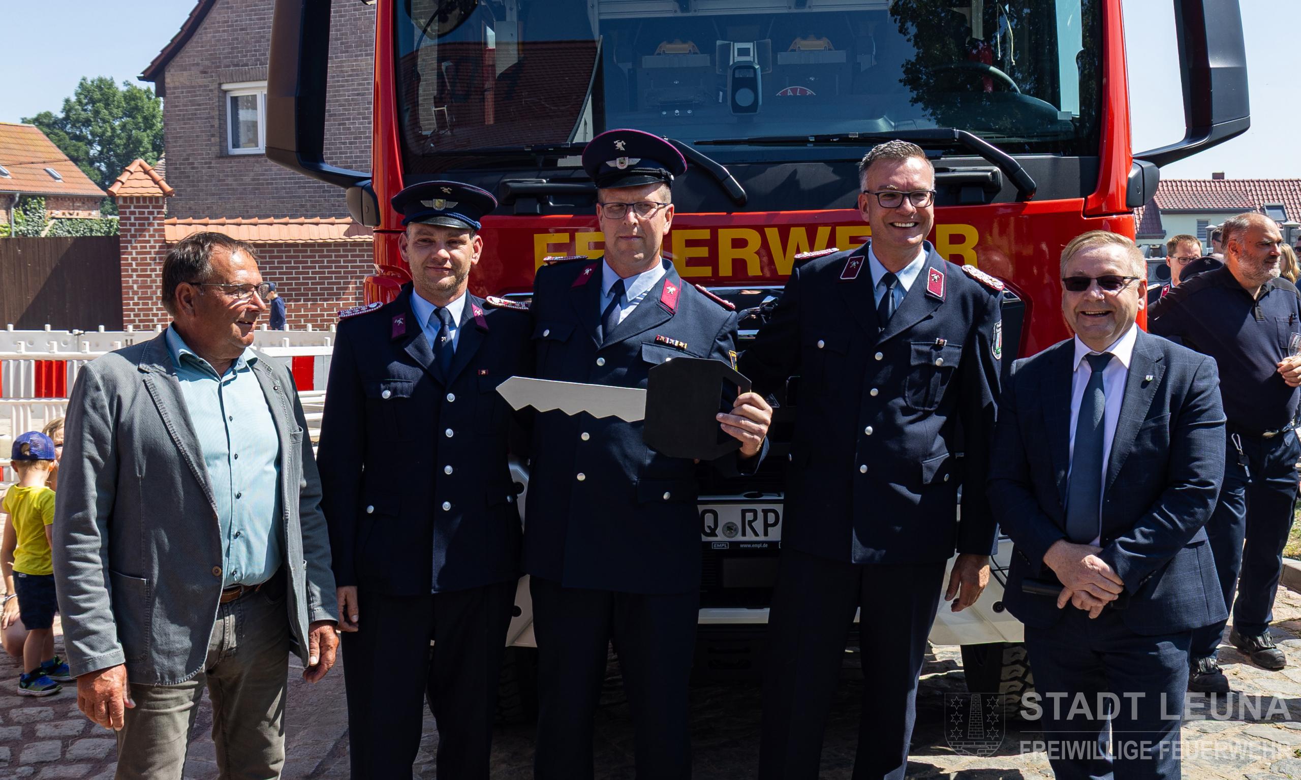 Bürgermeister Michael Bedla blickte auf die Entstehungsgeschichte der neuen Feuerwehrgarage zurück. Gemeinsam mit Ortsbürgermeister Ralf Gawlak, Ortswehrleiter Silvio Siecke, dessen Stellvertreter Martin Müller, dem Sachbearbeiter Hochbau Ralf Weißhaar sowie Stadtwehrleiter Matthias Forst wurde das symbolische Band zur offiziellen Einweihung durchtrennt. Nach den Grußworten der Gäste folgte ein besonderer Moment: Das neue MLF fuhr eindrucksvoll durch eine blaue Nebelwand vor. Im Anschluss überreichten Matthias Forst und Michael Bedla symbolisch den Fahrzeugschlüssel an Ortswehrleiter Silvio Siecke.