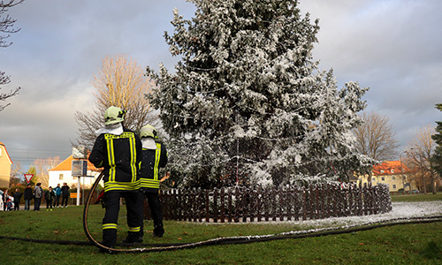 15 Uhr erklang am Freitag, 29. November, das erste Weihnachtslied vor dem Rathaus Leuna. Gespielt in diesem Jahr von den Kranzberger Musikanten aus Querfurt. Bürgermeisterin Dr. Dietlind Hagenau hob traditionell zur Eröffnungsrede an, als ein Feuerwehrlöschfahrzeug direkt auf den Markt zusteuerte. „Was mag da bloß passiert sein?“ dachte nicht nur der ein oder andere Besucher, auch die Bürgermeisterin wähnte die Kameraden der Freiwillen Feuerwehr Leuna im Einsatz. Zum Erstaunen aller hielt das Feuerwehrauto direkt zwischen Bühne und Weihnachtsbaum. Zügig rollten die Kameraden die Schläuche aus. Erleichtert und begeistert schauten die Weihnachtsmarktbesucher zu, wie es in Leuna direkt über dem Weihnachtsbaum zu schneien begann. Die Kameraden der Freiwilligen Feuerwehr berieselten den Baum mit Löschschaum und sorgten somit in freiwilligem Einsatz für einen winterlichen Anblick. Der Schaum ist natürlich biologisch abbaubar und sehr gut umweltverträglich.