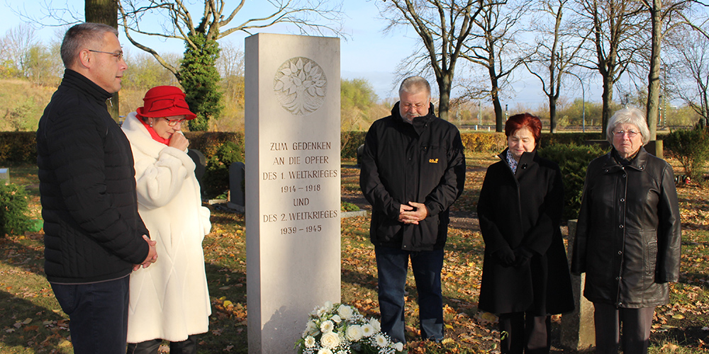 Der Volkstrauertag, vor 98 Jahren zum Gedenken an die Kriegstoten des Ersten Weltkrieges eingeführt, war am Sonntag, 19. November 2017, Anlaß für Bürgermeisterin Dr. Dietlind Hagenau und Stadträte, einen Kranz am Kriegsgräberdenkmal auf dem Stadtfriedhof in Leuna niederzulegen.
