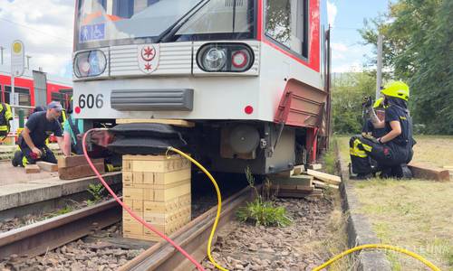 So konnte im Rahmen der Ausbildung ein realistisches Szenario simuliert werden, bei dem eine Straßenbahn in einem Unfall an einer Haltestelle verwickelt war. Zunächst musste die Bahn stromlosgeschalten werden. Dabei wurde die automatische sowie manuelle Trennung des Stromabnehmers vom Fahrdraht geübt. Als Nächstes wurde die notwendige Technik zum Heben einer Straßenbahn und Unterbaumaterial von den Feuerwehrfahrzeugen geholt. Nach Sicherung der Bahn wurde das einseitige Heben mittels Büffelwinde an der Bahnsteigkannte trainiert. Weiter ging es auf der anderen Seite mit pneumatischen Hebekissen. Zum Schluss wurde die Bahn noch von vorn angehoben.