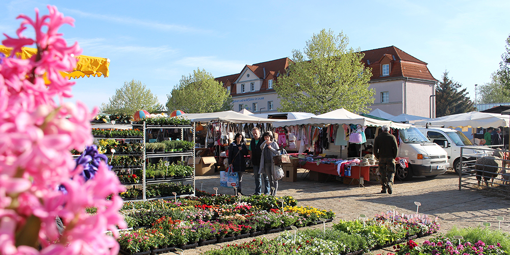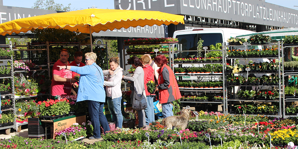 Der Winter, der sich Ende März noch mal von seiner besten Seite mit viel Schnee zeigte, war am 28. April in Leuna schon vergessen. Die Händler des Grünen Marktes präsentierten bei bestem Sonnenschein auf dem Haupttorplatz ihre Angebote. Insbesondere die einheimischen Gärtnereien wurden von den Besuchern dicht umlagert. Geranien, Petunien, Lobelien waren ebenso gefragt wie Gemüsepflanzen, hier natürlich allen voran die Tomatenpflanze. Mittlerweile kommt auch dem Leunaer Gärtner nicht mehr nur die „Harzfeuer“ in die Erde, es dürfen gern ausgefallene Sorten sein.