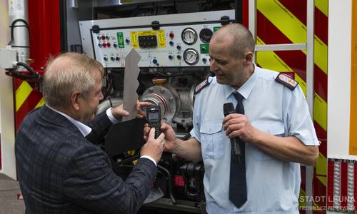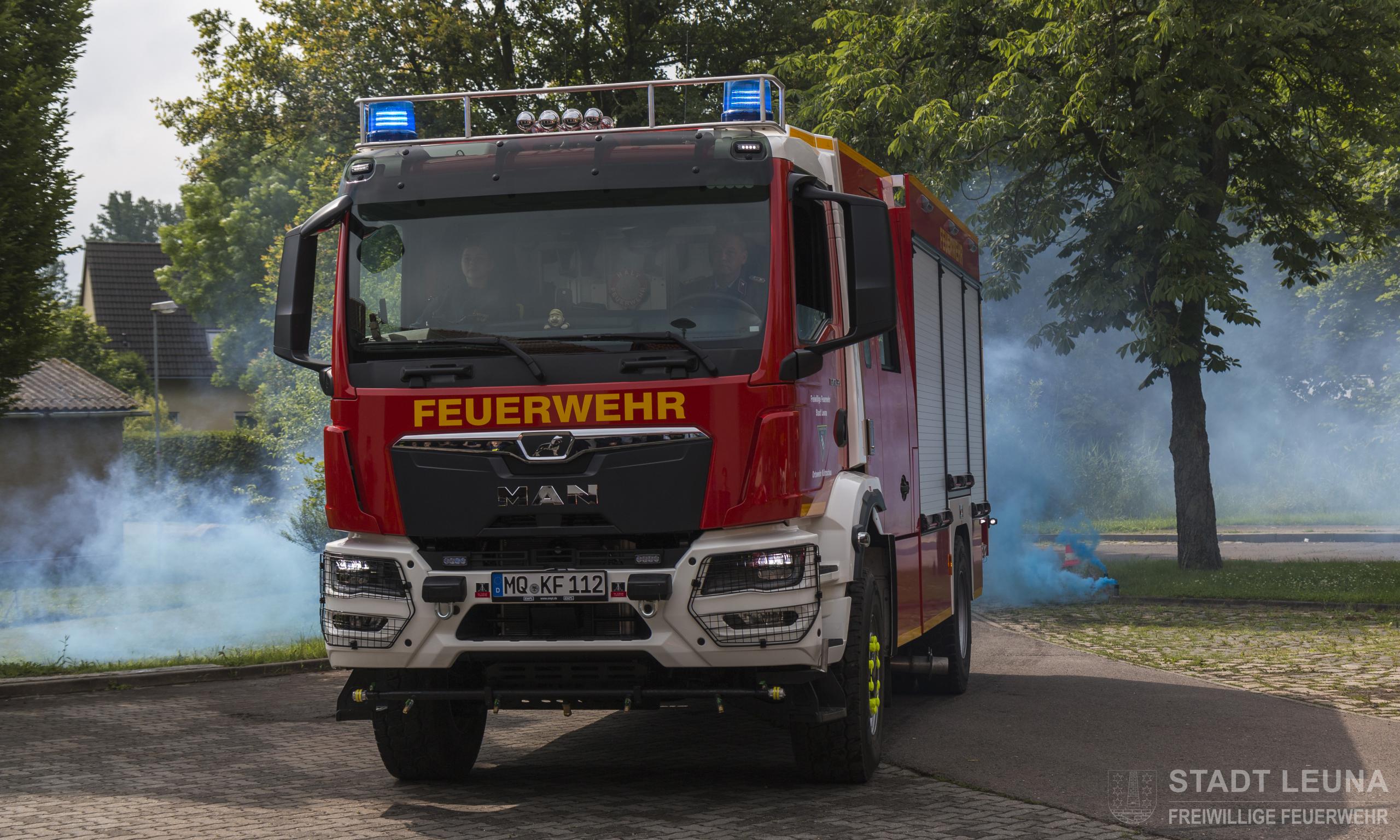 Am 1. Juni 2024 wurde das neue Tanklöschfahrzeug (TLF 4000) der Ortsfeuerwehr Kötzschau offiziell in Dienst gestellt. Doch bevor die Gäste und Besucher das neue Fahrzeug bestaunen konnten, mussten sie sich etwas gedulden. Ortswehrleiter, André Klinge, begrüßte zunächst alle Kameraden und Gäste. Während der Begrüßung wurde vor der Fahrzeughalle eine Sichtschutzwand aufgebaut. Bürgermeister, Michael Bedla, führte zunächst einiges zu den Wertegang und den Details des Fahrzeuges aus. Dann wurde die Sichtschutzwand zurückgebaut und es erschien eine Nebelwand, aus der das neue TLF 4000 erschien und auf dem Vorplatz des Feuerwehrhauses fuhr. Herr Bedla übergab symbolisch den Schlüssel an Herrn Klinge und drückte am Funkgerät den Status 2. Damit war das Fahrzeug offiziell bei der Leitstelle des Landkreises einsatzbereit. Der stellvertretende Stadtwehrleiter, Matthias Fiedler, und Michael Bedla wünschten den Kameradinnen und Kameraden allzeit gute Fahrt, möglichst wenig Einsätze und immer ein gesundes Zurückkommen der Einsatzkräfte. Gleichzeitig dankten sie für die engagierte ehrenamtliche Arbeit.