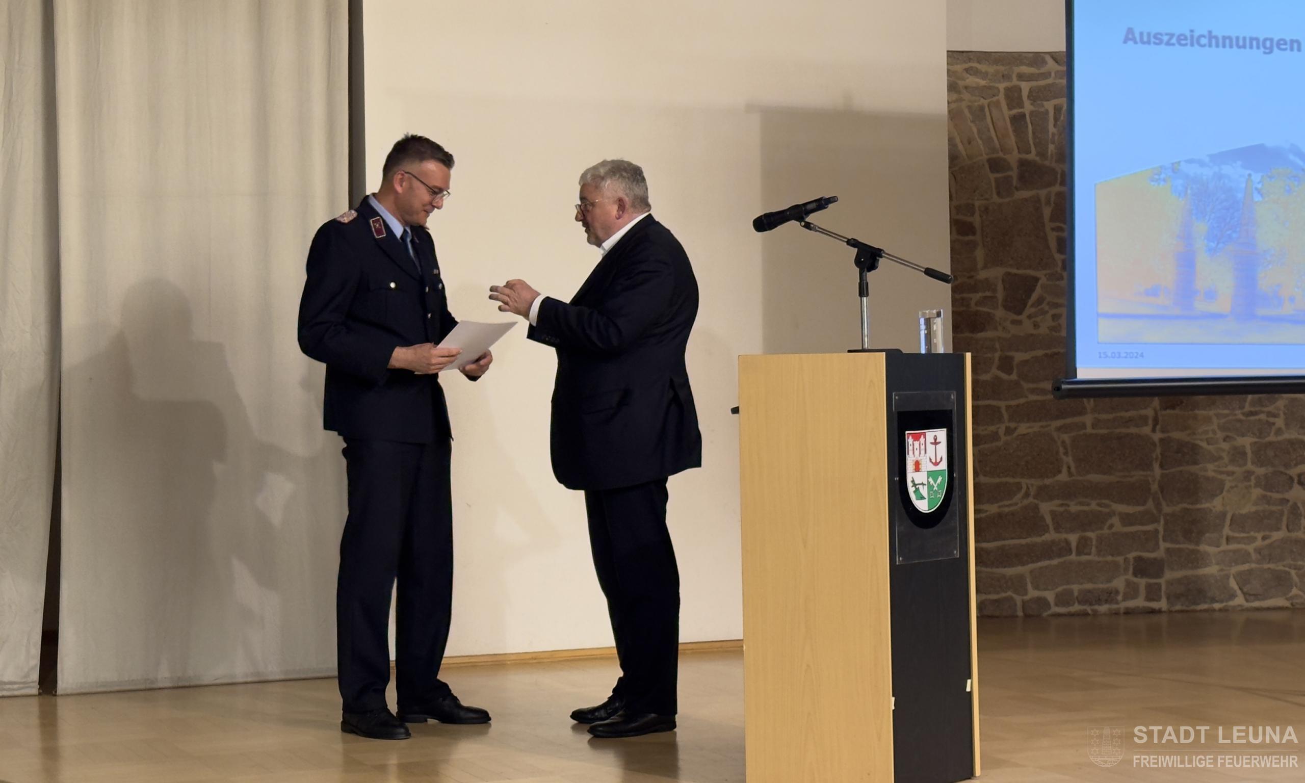 Matthias Forst wurde mit der Feuerwehrspange Sachsen-Anhalt für seine Arbeit als Stadtwehrleiter von Leuna gewürdigt. Kamerad Forst hat wichtige Entwicklungen im Brandschutz angestoßen und begleitet. Damit hat er die Entwicklung der Feuerwehren der Stadt Leuna sowohl in ihrer personellen als auch ihrer technischen Ausstattung maßgeblich vorangebracht.