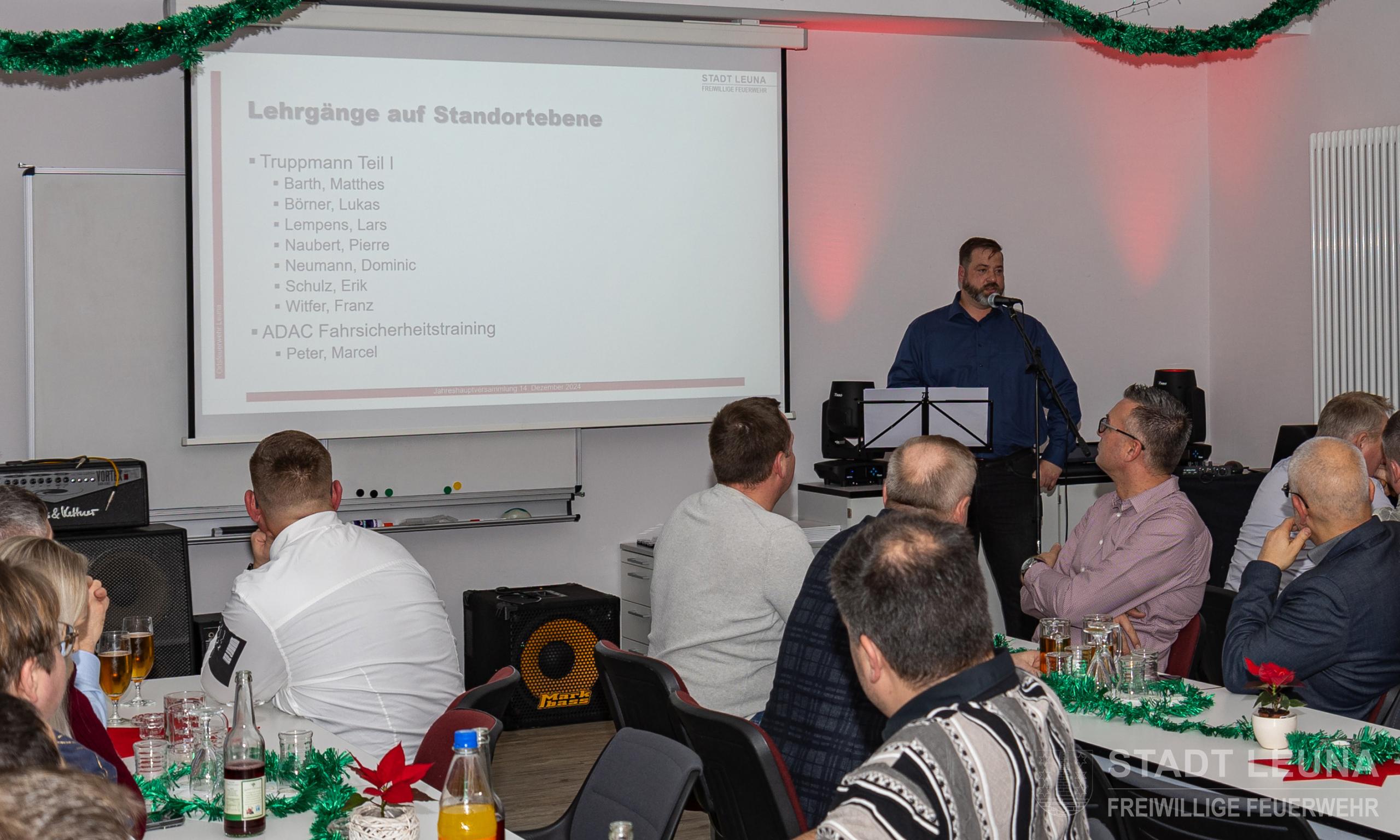 Die Jahreshauptversammlung der Ortsfeuerwehr Leuna fand am Samstag, den 14. Dezember 2024 statt. Ortswehrleiter, Nico Klose, begrüßte alle Kameradinnen und Kameraden, den Bürgermeister, Herrn Michael Bedla, Vertreter des Stadtrates sowie Gäste und begann mit seinem Jahresbericht für das Jahr 2024.