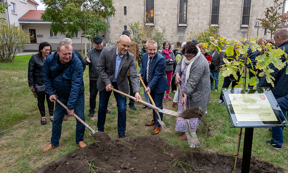 Mit diesen Worten pflanzten Olga Kaczmarek (stellvertretende Bürgermeisterin Jaraczewo), Roman Matuszak (Stadtratsvorsitzender Jaraczewo), Michael Bedla (Bürgermeister Leuna) und Daniel Krug (Stadtratsvorsitzender Leuna) einen „Baum der Freundschaft“ am Kirchplatz in Leuna. Der Baum, eine Stiel-Eiche, symbolisiert die Freundschaft zwischen den Partnerstädten.
