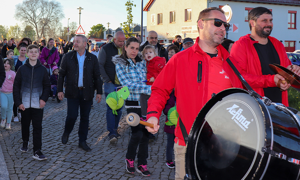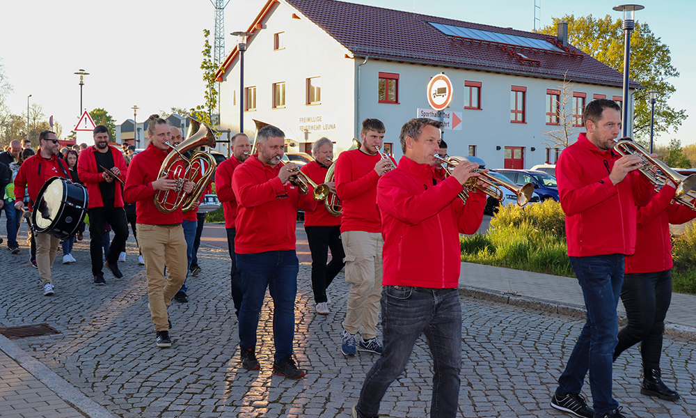 „Zu Walpurgis ist ganz Leuna auf den Beinen“ – damit hatte eine Besucherin aus Leuna Recht, denn auch in diesem Jahr feierten mehr als 1.000 Gäste das Walpurgisfest auf der Alten Rollschuhbahn. Der Festumzug startete pünktlich 19:30 Uhr an der Feuerwehr Leuna in der Feldstraße. Und dass, obwohl die Männer keine 15 Minuten zuvor zu einem Einsatz, ihrem zweiten an diesem Tag, gerufen wurden. Glücklicherweise war die Brandbekämpfung eines Containers schnell erledigt.