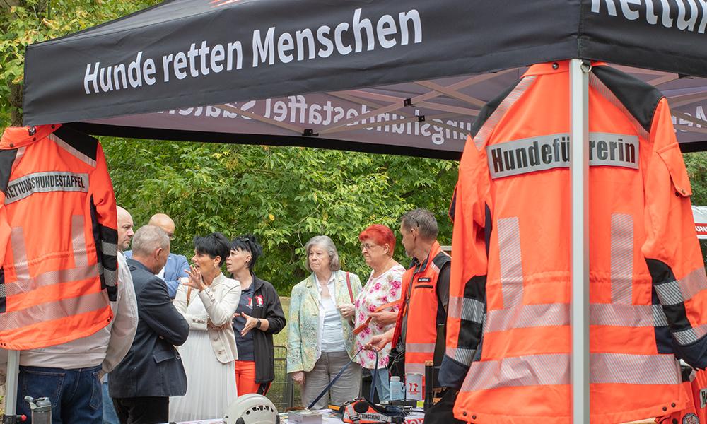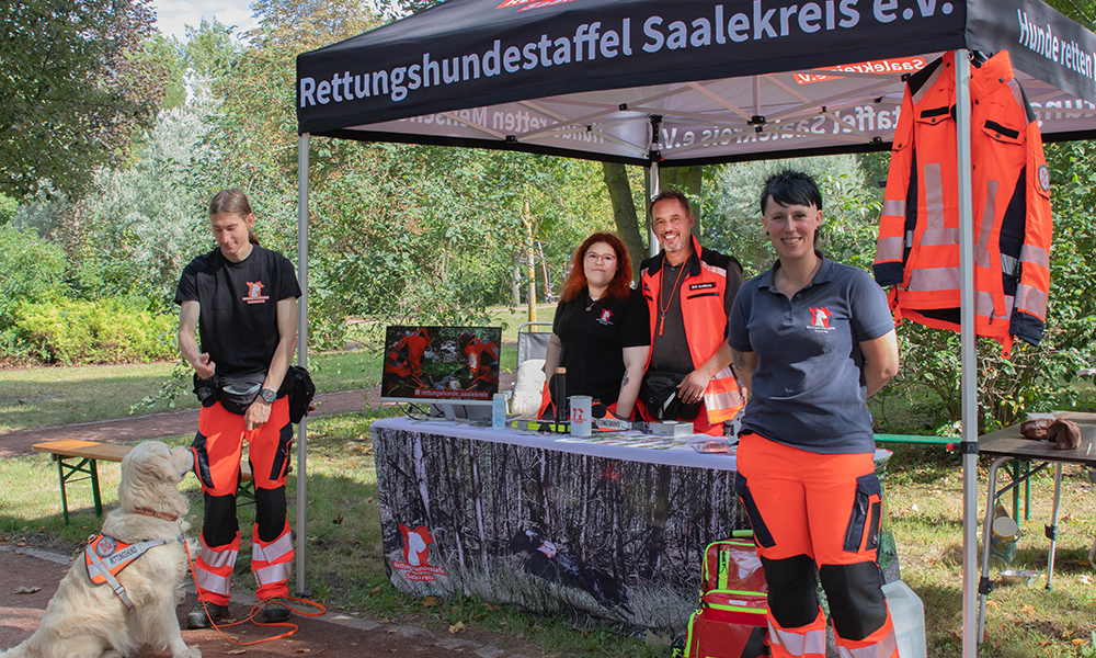 Mit Lebensrettern auf 4 Pfoten war die Rettungshundestaffel des Saalekreises vor Ort. Die Hunde zeigten, was sie täglich trainieren, die Mitglieder der Rettungshundestaffel informierten, wie wichtig die ehrenamtliche Arbeit ist, um vermisste Personen zu finden und dadurch Leben zu retten.