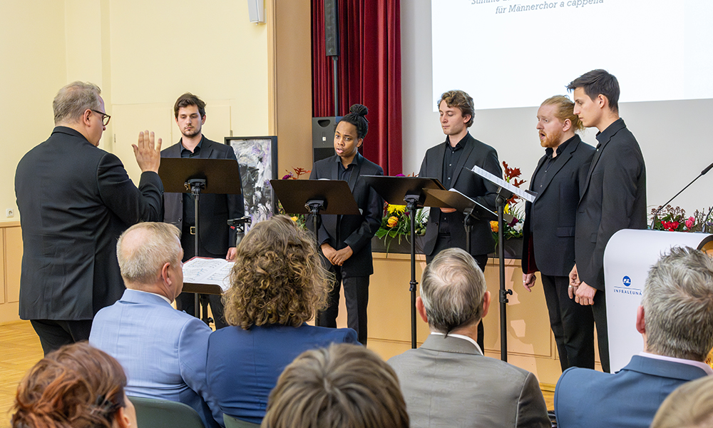 Musikalisch begleitet wurde der Abend von AuditivVokal aus Dresden unter der künstlerischen Leitung von Olaf Katzer. Mit der Welturaufführung von „Drei Gesängen für Männerchor a capella“ zu Walter Bauers „Stimmen aus dem Leuna-Werk“ (Komposition Walter Furrer, 1933), begeisterten die jungen Sänger das Publikum.