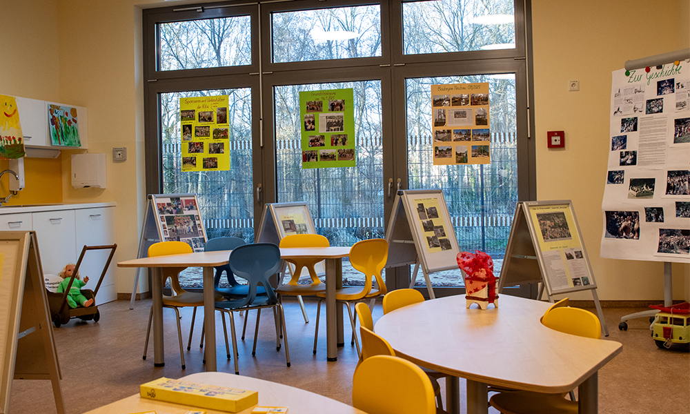 Die Kleinsten der Einrichtung hatten mit ihren Erzieherinnen ein kleines Programm vorbereitet, sie sangen und hüpften freudig bei ihrem Auftritt vor dem Publikum. Leiterin Heike Rehfeld führte anschließend mit Heike Held, Erzieherin, durch die neue Einrichtung. Der Andrang der Gäste war sehr groß, die moderne Kita anzuschauen. In Küche und Speiseraum konnte eine Ausstellung mit vielen Bildern und Informationen zu den „Sonnenkäfern“ besichtigt werden. Frau Reck, erste Erzieherin der Kita, die der Einrichtung den Namen „Sonnenkäfer“ verliehen hatte, ließ sich die Möglichkeit der Besichtigung nicht entgehen. Sie hatte vor 70 Jahren die ersten Kinder in Zöschen betreut.
