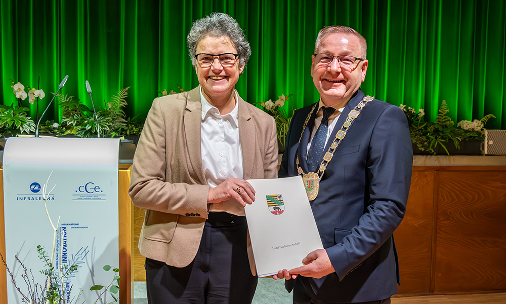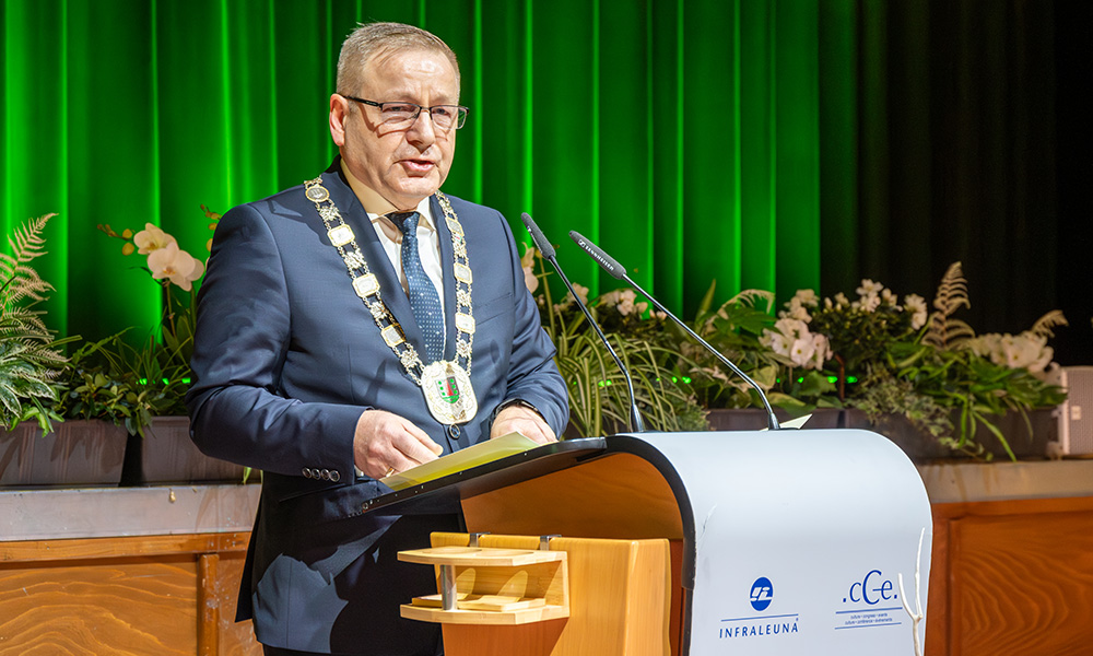 Nach dem Rück- und Ausblick des Bürgermeisters überbrachte Dr. Lydia Hüskens, Ministerin für Infrastruktur und Digitales des Landes Sachsen-Anhalt, ein Grußwort der Landesregierung und einen Fördermittelbescheid über 1,2 Millionen Euro. Das Programm „Wachstum und nachhaltige Erneuerung - lebenswerte Quartiere gestalten“ hilft Städten und Gemeinden, bauliche Strukturen und den öffentlichen Raum an neue und sich ändernde Bedarfe anzupassen. 1 Million Euro reicht die Stadtverwaltung gemäß dem Integrierten städtebaulichen Entwicklungskonzept (ISEK) an die InfraLeuna GmbH, der Betreiberin des cCe Kulturhauses, weiter. Mit der Finanzspritze können dringend notwendige Sanierungsarbeiten in Angriff genommen werden. Als stadtbildprägendes Objekt und für die Bereicherung der Kulturlandschaft Leunas stellt das Kulturhaus eine wichtige Einrichtung dar.