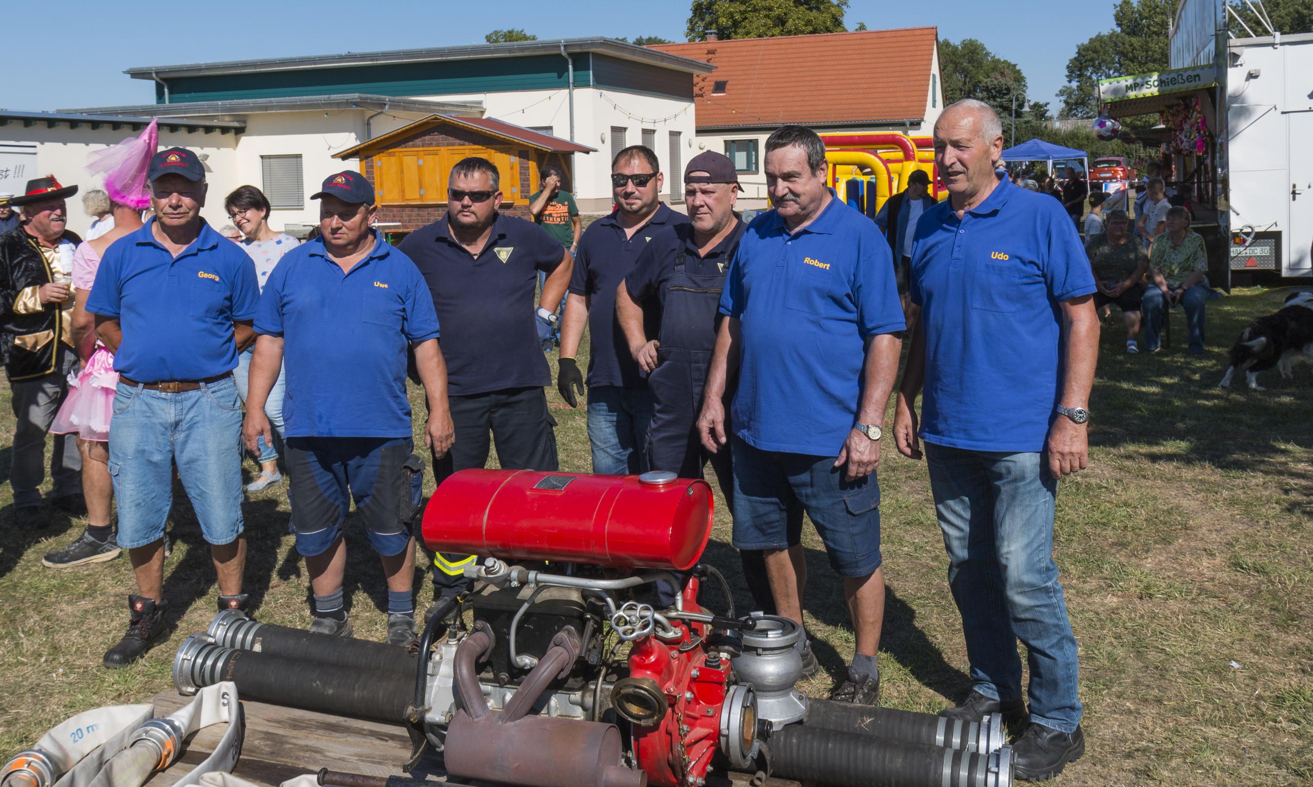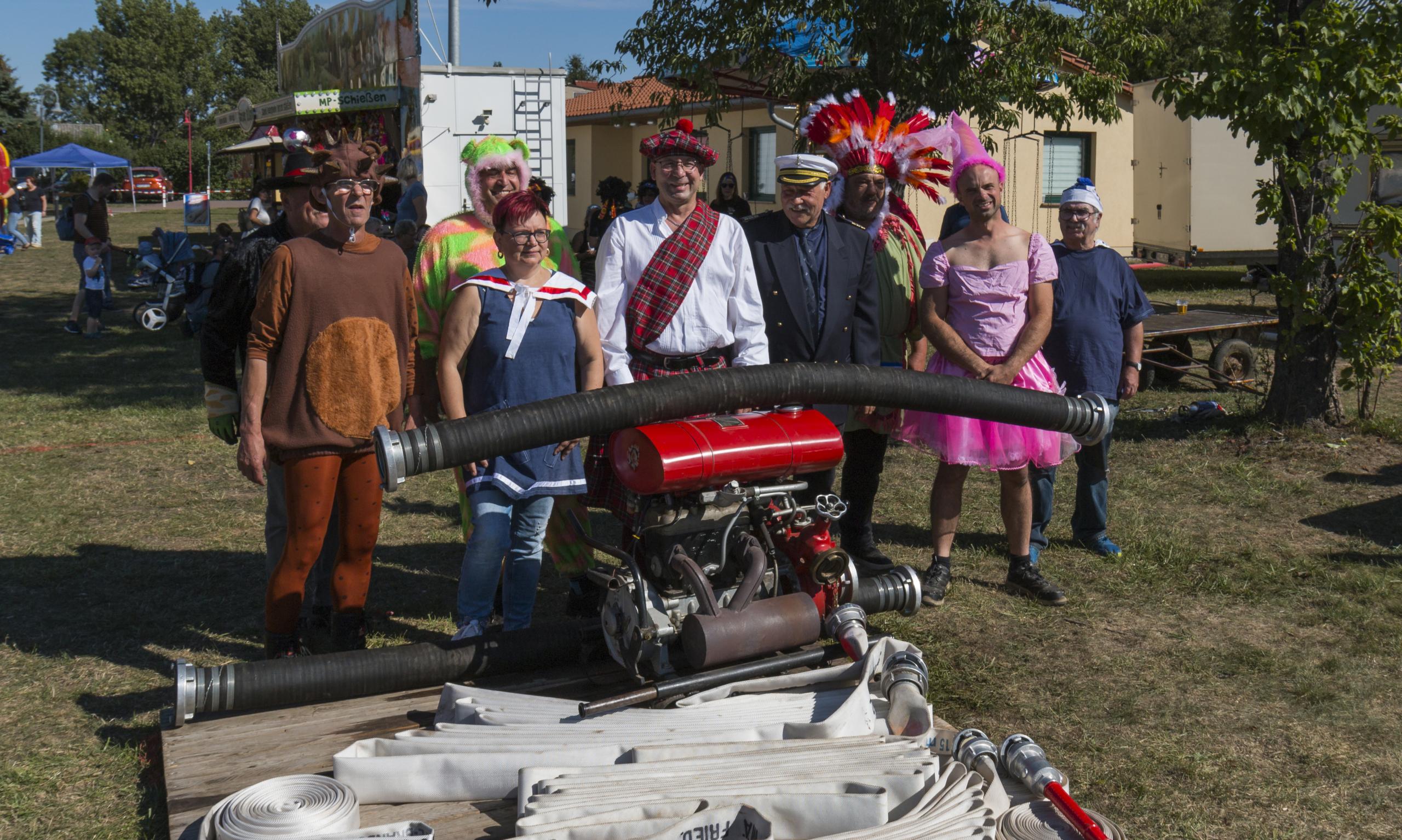 In diesem Jahr hatten sich die Feuerwehrfrauen aus Friedensdorf das Motto „ Boney M.“ ausgedacht und sorgten mit ihrer Choreografie für die notwendige Stimmung und begannen zugleich mit dem Löschangriff Nass. Die Mannschaft aus Wallendorf startete als Köche. Dabei betankten sie zunächst Ihre Tragkraftspritze mit Suppengrün und Zwiebeln. Der Traditionsverein Burgliebenau zeigte sich kunterbunt mit ihren Kostümen der vergangenen Jahre. Die Oldies aus Friedensdorf starteten mit ihrem traditionellen Outfit. Mit der individuellen Darstellung und den tollen Kostümen sorgten die Mannschaften bei den Gästen und Wettkämpfern gleichermaßen für ausgesprochene Heiterkeit. Alle Feuerwehrfrauen und -männer fühlten sich als Sieger. Dabei war der Pokal am Ende des Oldiecups ganz in Vergessenheit geraten.