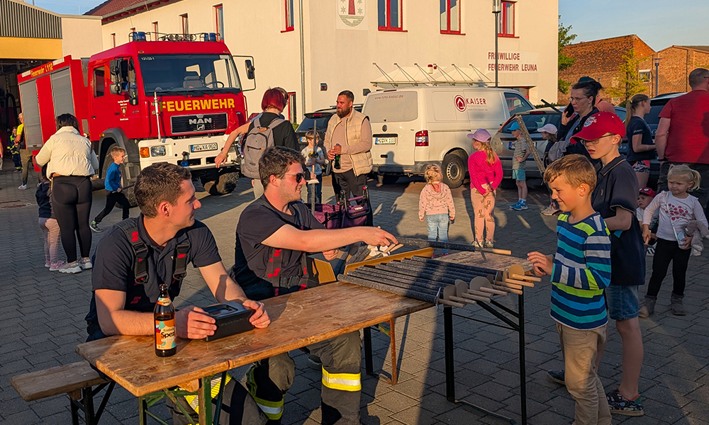 Ausgerüstet mit „Spendenfeuerlöschern“ erschreckte die verkleidete Jugendfeuerwehr Leuna die Besucher und Besucherinnen der traditionellen Walpurgis Veranstaltung am 30.04. in Leuna. Der Platz der alten Rollschuhbahn wurde wieder festlich geschmückt und die schaurige Papierhexe thronte über den ca. 1500 Gästen.