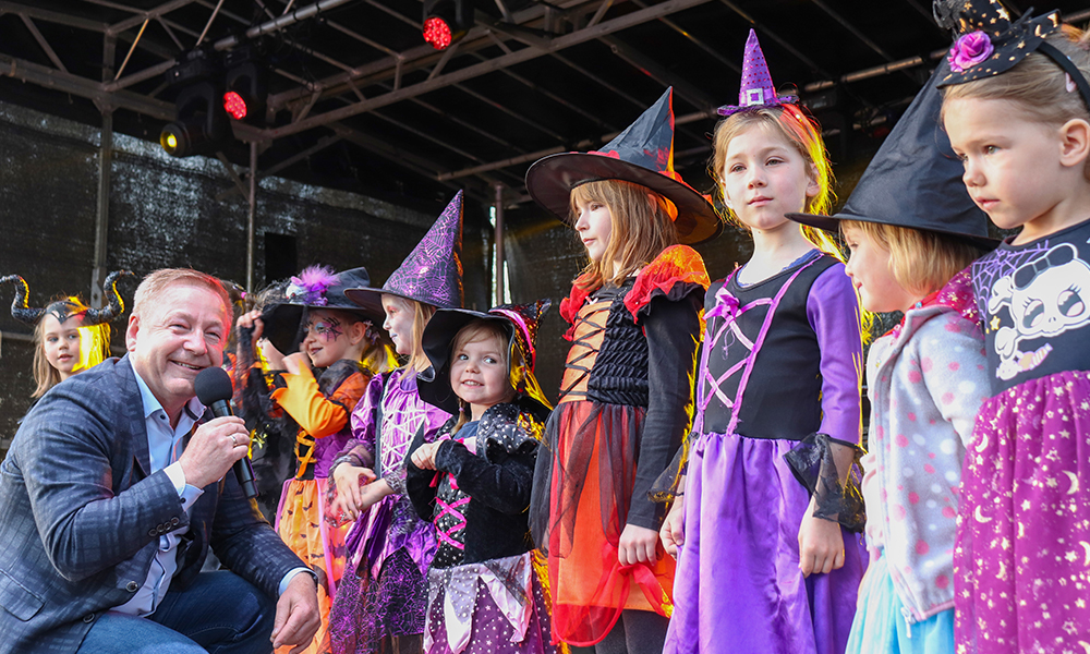 Nach der Entzündung des meterhohen Walpurgisfeuers eröffnete Bürgermeister Michael Bedla die Veranstaltung und wies auf die neuen Sicherheitsmaßnahmen hin. Danach folgte ein Highlight für die kleinen, verkleideten Hexen vor Ort. Zusammen mit drei Bürgern aus dem Publikum prämierte Michael Bedla die drei schauigschönsten Kinderkostüme mit jeweils einem 50 Euro Gutschein für die Bäderbetriebe der Stadt. Darüber konnten sich Mathilda, Pauline und Frieda freuen.