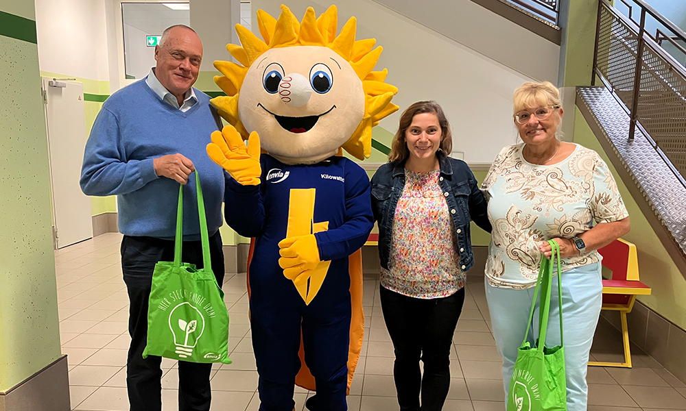 „Kilowattchen“ und Stefanie Ladenthin, Kommunalbetreuerin enviaM, übergaben die Hefte an Sabine Sadlo, Rektorin der Grundschule in Leuna, und Dr. Volker Stein, Fachbereichsleiter Soziales, Jugend, Sicherheit und Ordnung der Stadt Leuna.
