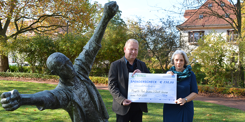 Eine Spende in Höhe von 250 Euro überreichte das Unternehmen mediaprint Graphisches Institut Eckmann der Stadt Leuna für den Plastik-Park.