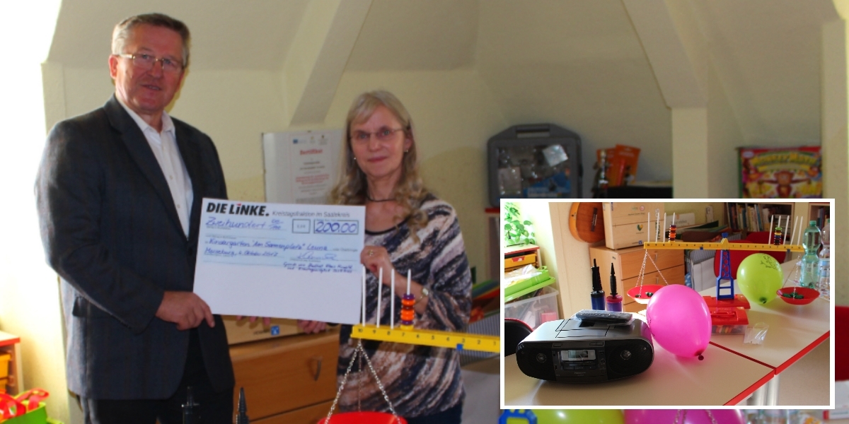 Am Donnerstag, 19.Oktober 2017 überreichte Herr Klaus Hunold, Mitglied im Kreistag Saalekreis, Fraktion Die Linke und Stadtrat von Leuna, an die Leiterin der Kita „Am Sonnenplatz“ einen Scheck über 200 €.