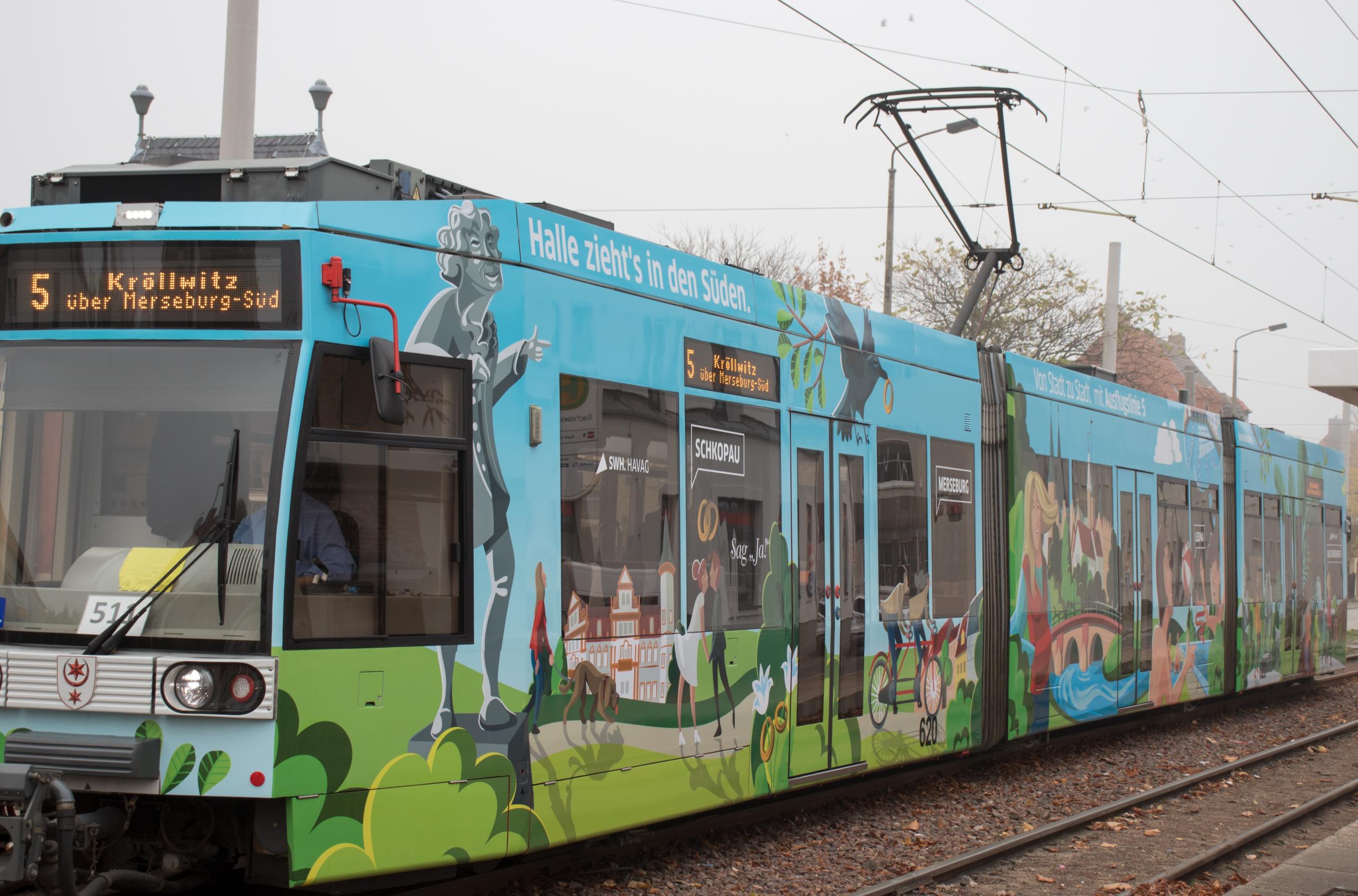 Halle (Saale), 5. November 2018 – Mit ihrer großen Schwesterstadt Halle werben die kleineren, südlich gelegenen Städte und Gemeinden Merseburg, Schkopau, Leuna und Bad Dürrenberg ab jetzt mit dem Motto „Halle zieht’s in den Süden“ gemeinsam auf einer bunt gestalteten Straßenbahn für ihre touristischen Highlights. Sie bündeln ihre Kräfte, da sich alle Orte entlang der Linie 5 befinden. Die Straßenbahnlinie 5 der Halleschen Verkehrs-AG (HAVAG), einem Unternehmen der Stadtwerke Halle-Gruppe, ist mit 31 Kilometern Länge eine der längsten Straßenbahnlinien der Welt und gehört damit zu den besonderen Attraktionen des Öffentlichen Personennahverkehrs Deutschlands.