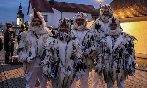 Bunte Figuren, allen voran der Läufer oder auch Bändermann genannt, ziehen durch die Ortschaft, nachdem das Fest 6 Uhr morgens im Gasthof „Zur Linde“ mit Musik und viel guter Laune begonnen hat. Die bunten wehenden Bänder am Gewand des Läufers verkünden den nahenden Frühling. Hinter ihm bildet sich ein langer Zug aus Musikkapelle, Soldaten, Vögeln, Erbsbär, Eierfrauen, Wurststangenträgern, Milchkannenträger, Handelsmännern, Küchenmädchen und Küchenburschen, Schwarzmachern, Pritschern…. und dem Registrator hoch zu Roß.