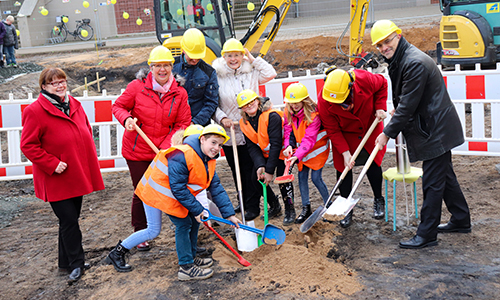 Bild "Grundsteinlegung" zeigt: Claudia Müller (Fachbereich Bau), Silvio Lämmerhirt (Fachbereichsleiter Bau, hinten), Dr. Dietlind Hagenau (Bürgermeisterin), Dr. Elke Bürkner (Plingel GmbH Planungsbüro, hinten Mitte), Sabine Sadlo (Rektorin), Daniel Krug (Stadtratsvorsitzender, hinten rechts) sowie Denis Rashiti, Hannah Gewald, Leonie Baum und Jessica Rossa