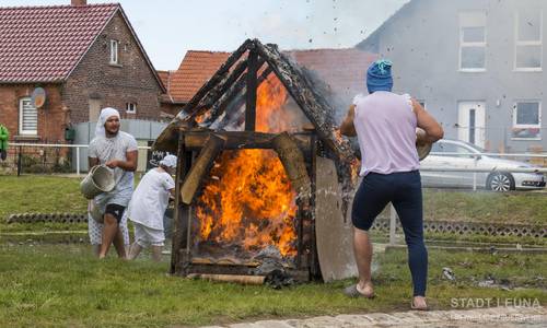 Nach dem Mittag aus der Gulaschkanone und vom Grill ging es mit einer Vorführung weiter. Dabei brannte ein kleines Holzhaus am Dorfteich. Die Bewohner alarmierten die Nachbarn und gemeinsam wurde der Brand mit einer Eimerkette versucht unter Kontrolle zu bringen. Die Sirene erklang und ein Zeitsprung war zu sehen. Aus der Eimerkette wurde eine historische Pferdespritze des Vereins zur Traditionspflege der Feuerwehr e.V. aus Rampitz - Thalschütz, die von Kameraden in historischen Uniformen bedient wurde. Die Sirene ertönte ein weiteres Mal. Die Pferdespritze verschwand. Ein Löschgruppenfahrzeug (LF 20/16) fuhr Richtung Festplatz. Die Jugendfeuerwehr Günthersdorf-Kötschlitz zeigte einen klassischen Löschangriff mit Atemschutzdummies. Ein weiteres Mal konnte die Sirene wahrgenommen werden. Das Hubrettungsfahrzeug (TGM 23/12) der Feuerwehr Bad Dürrenberg und das neue Tanklöschfahrzeug (TLF 4000) der Ortsfeuerwehr Kötzschau fuhren vor und bauten einen weiteren Löschangriff auf. Die Jugendfeuerwehr Günthersdorf-Kötschlitz besetzte den TGM und löschte nun aus der Luft das brennende Haus. Den Gästen wurde so der Wandel des Löschwesens und der Technik der Feuerwehr anschaulich präsentiert.