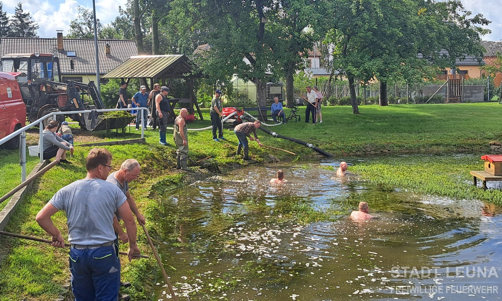 Retten, Löschen, Bergen, Schützen – sind die Aufgaben der Feuerwehr. Doch auch darüber hinaus ist die Feuerwehr ein verlässlicher Partner. So führte die Ortsfeuerwehr Rodden am 15. September 2023 einen Arbeitseinsatz im Ortsteil Pissen durch. Dabei waren die Einsatzkräfte mit ihrer ganz besonderen persönlichen Schutzausrüstung zu sehen. In Badehose ging es bei angenehmen 20°C in das kühle Nass. Der mit Wasserlinsen und anderen Ablagerungen übersäte Teich wurde gereinigt und lädt nunmehr wieder zum Verweilen ein.
