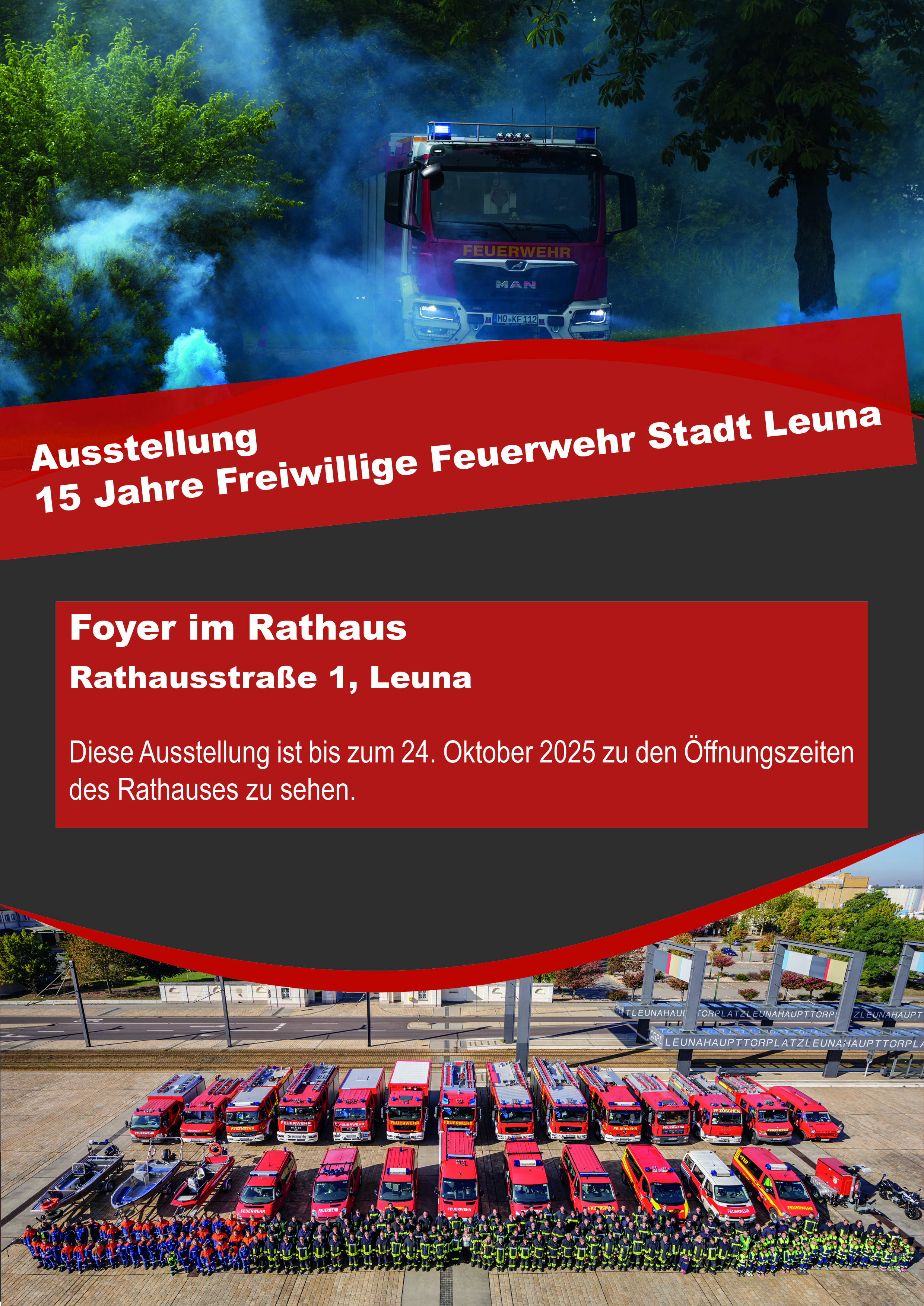 Am 1. September 2025 wurde im Foyer des Rathauses Leuna die Ausstellung „15 Jahre Freiwillige Feuerwehr der Stadt Leuna“ feierlich eröffnet. Bürgermeister Michael Bedla eröffnete die Schau gemeinsam mit der Stadtwehrleitung und würdigte dabei das Engagement aller Beteiligten. Besucherinnen und Besucher können die Ausstellung noch bis zum 24. Oktober 2025 besichtigen.