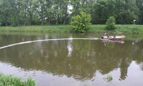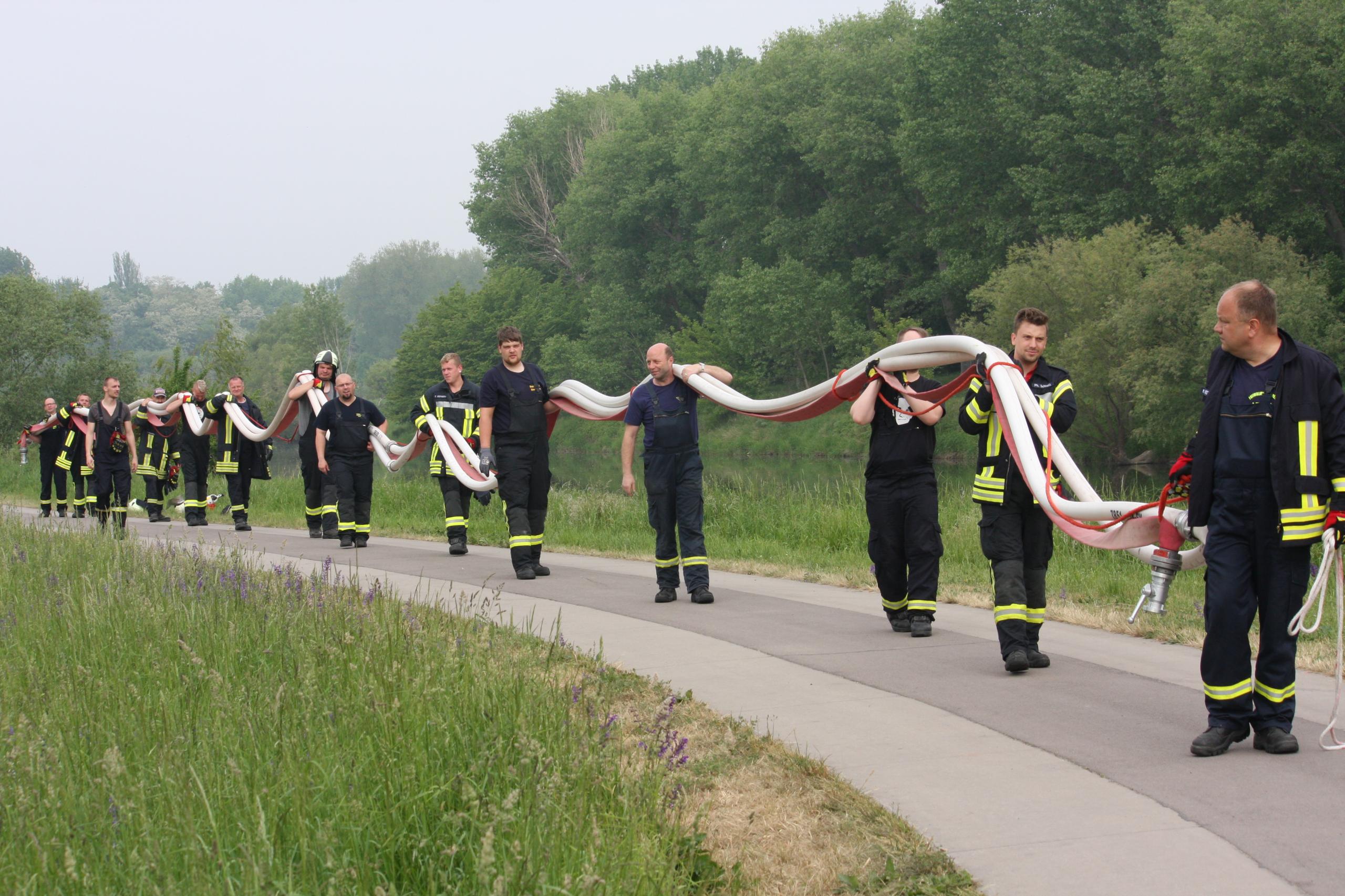 Zu Übungszwecken stand am 12. Mai 2018 bei der Ortsfeuerwehr Leuna das Errichten einer Ölsperre auf dem Programm für den praktischen Dienst. Als Übungsgelände war der Saaleabschnitt am ehemaligen Fährhaus ausgewählt. Um die provisorische Ölsperre zu bilden, wurden drei Stück B-Schläuche ausgerollt, mit Luft befüllt und mit einer Feuerwehrleine verknüpft. Mit dem Rettungsboot wurde das Gebinde auf der Saale aufgespannt. Nachdem ein Schlauch mit Wasser gefüllt war (die beiden anderen behielten Luft), konnte das Gebinde seine Aufgabe erfüllen.