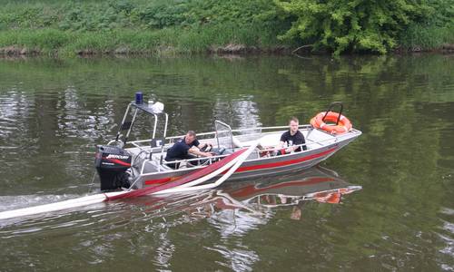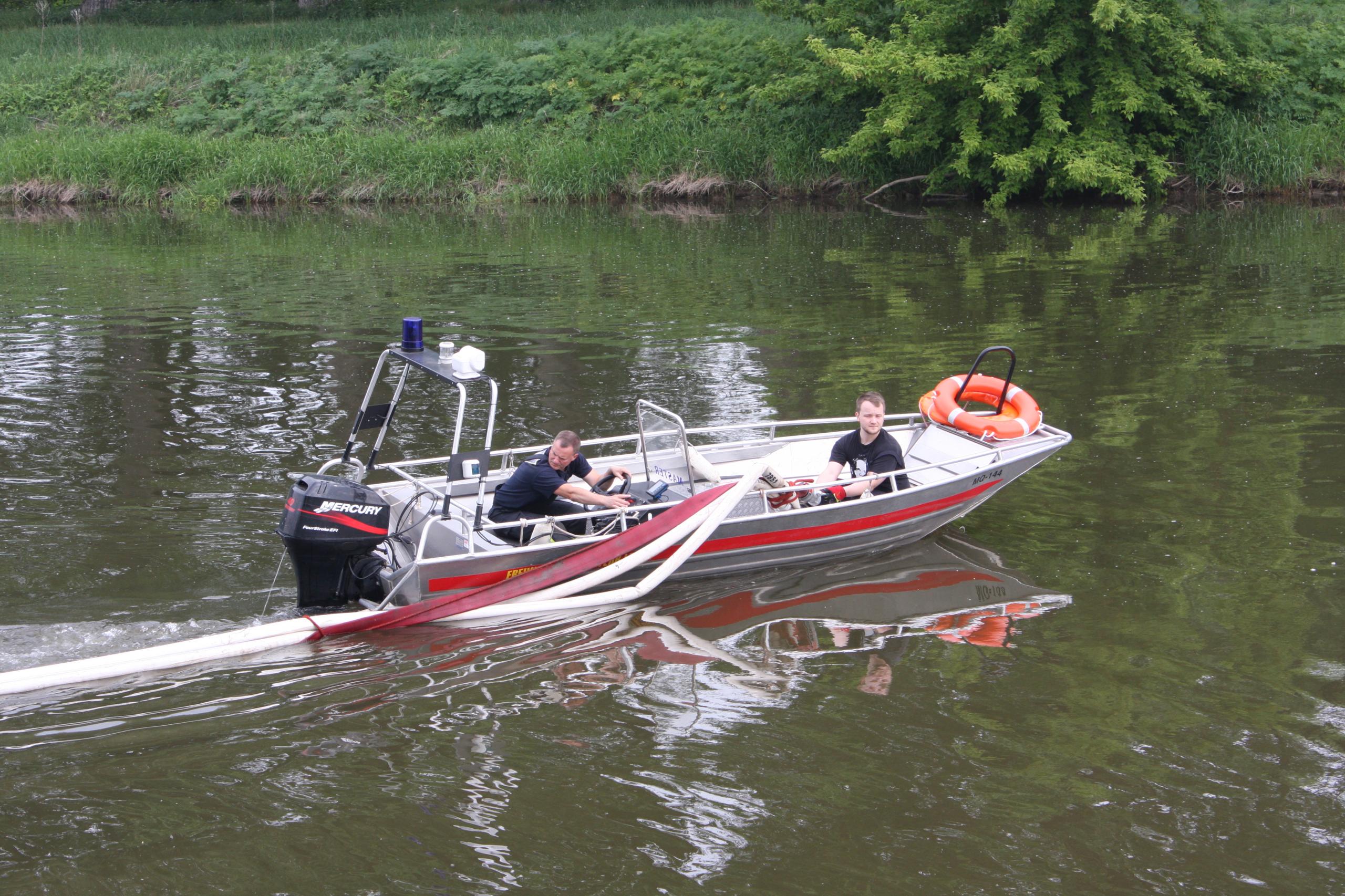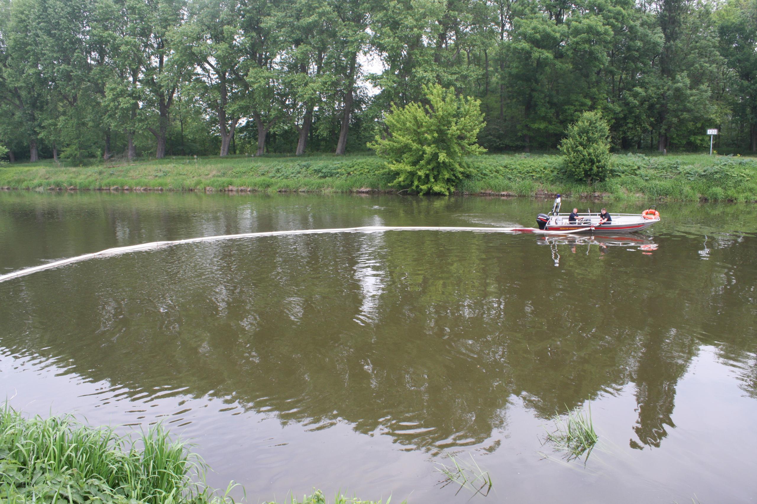 Die Leunaer Ortsfeuerwehr errichtete eine provisorische Ölsperre auf der Saale