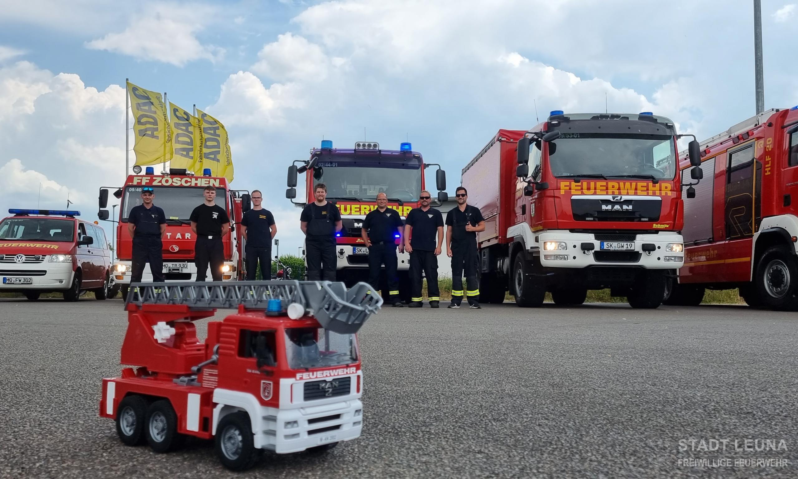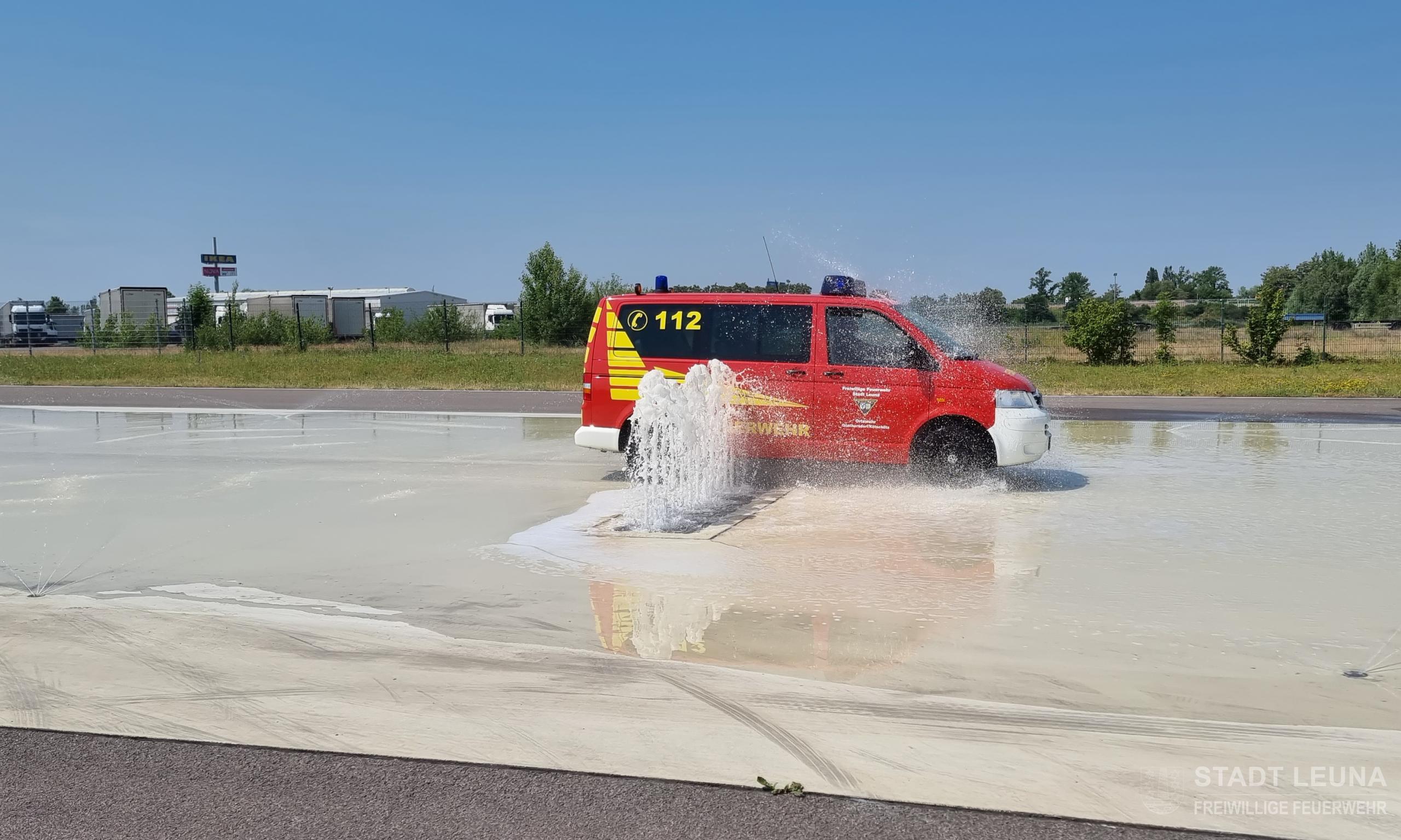 Um diese psychischen aber auch physischen Belastungen zu kennen und in Gefahrensituationen richtig reagieren zu können, haben insgesamt 7 Einsatzkräfte am 10. Juni 2023 ein Fahrsicherheitstraining am ADAC Fahrsicherheitszentrum Leipzig - Halle absolviert. In diesem speziell für Rettungskräfte durchgeführten Training lernten die Teilnehmer, dass brenzlige Situationen schneller als vermutet entstehen können. Sie erfuhren ihre eigenen Grenzen, die der Fahrzeuge und auch der Fahrphysik. Neben der richtigen Sitzposition, Lenktechnik und Blickführung, mussten die Teilnehmer im praktischen Teil Slalom fahren und eine Gefahrenbremsung auf nasser und trockener Fahrbahn durchführen. Es folgten Kurvenfahrten auf nassem Untergrund mit dem Ziel das Fahrzeug dabei ausbrechen zu lassen. Ein letzter Bestandteil war die Fahrt auf nasser Fahrbahn mit plötzlich aus dem Boden auftretenden Wasserhindernissen, die es galt auszuweichen.