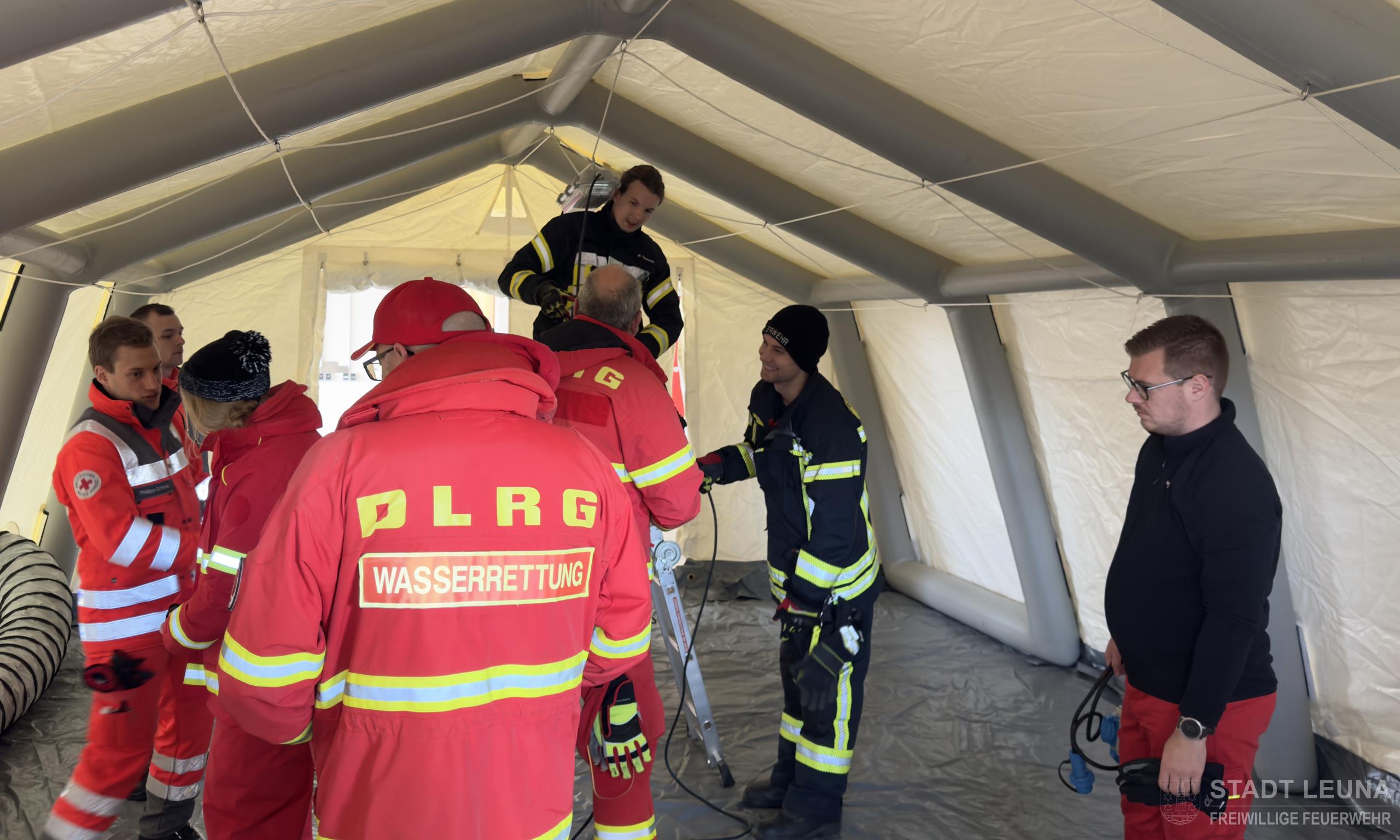 Am Samstag, den 20. April 2024 fand am Standort der Ortsfeuerwehr Zöschen-Zweimen eine gemeinsame Fortbildung zum Thema Behandlungsplatz 50 (BHP 50) statt, an denen die DLRG Leuna-Merseburg e. V., die Fachdienste Sanität I und II sowie die Ortsfeuerwehren Friedensdorf, Kreypau, Leuna, Spergau und Zöschen-Zweimen teilgenommen haben. Ebenso waren der Kreisbrandmeister mit seinen Stellvertretern sowie ein Vertreter des Landkreises anwesend.