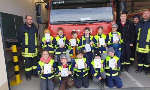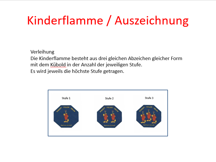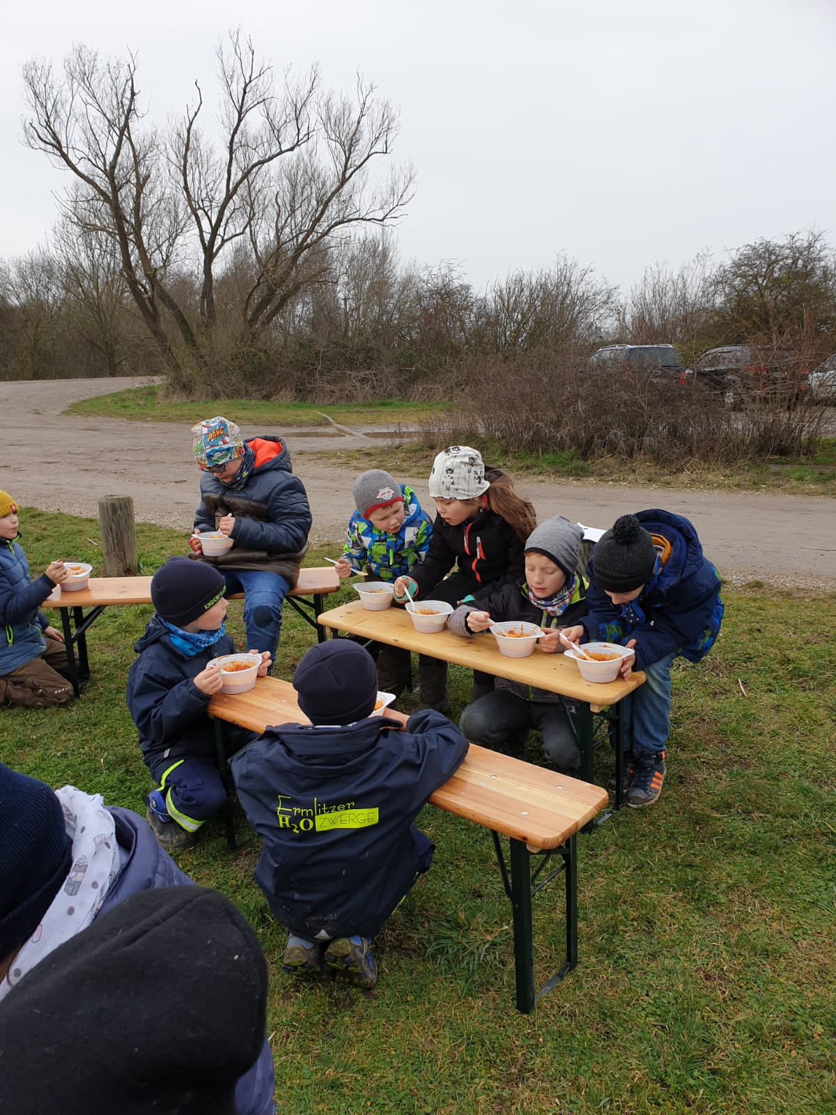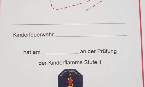 Nachdem die Kinder alle Aufgaben erfolgreich erfüllt hatten, gab es als Belohnung das Mittagsessen aus der Gulaschkanone, natürlich Nudeln mit Tomatensoße… Und was noch wichtiger war: Nach dem Mittagessen bekam jedes Kind für die „Kinderflamme“ eine eigene Urkunde und eine Anstecknadel mit dem heißbegehrten "Kübold".