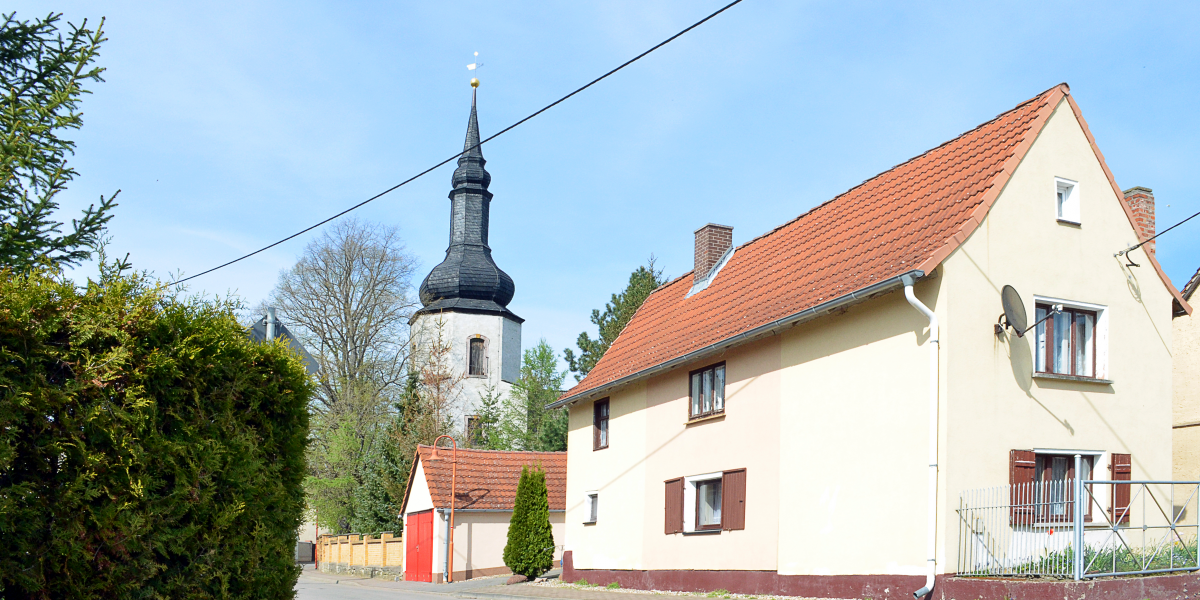 Versteckt hinter einer Bahnlinie ist Friedensdorf von der Bundesstraße 181 kaum zu erkennen. Bei genauerem Hinsehen entdeckt man auch die evangelische Kirche im Ort.